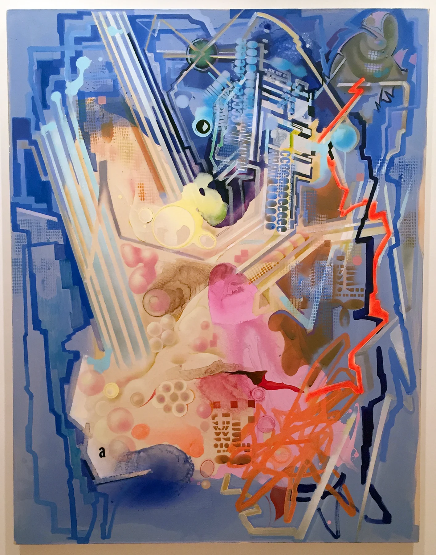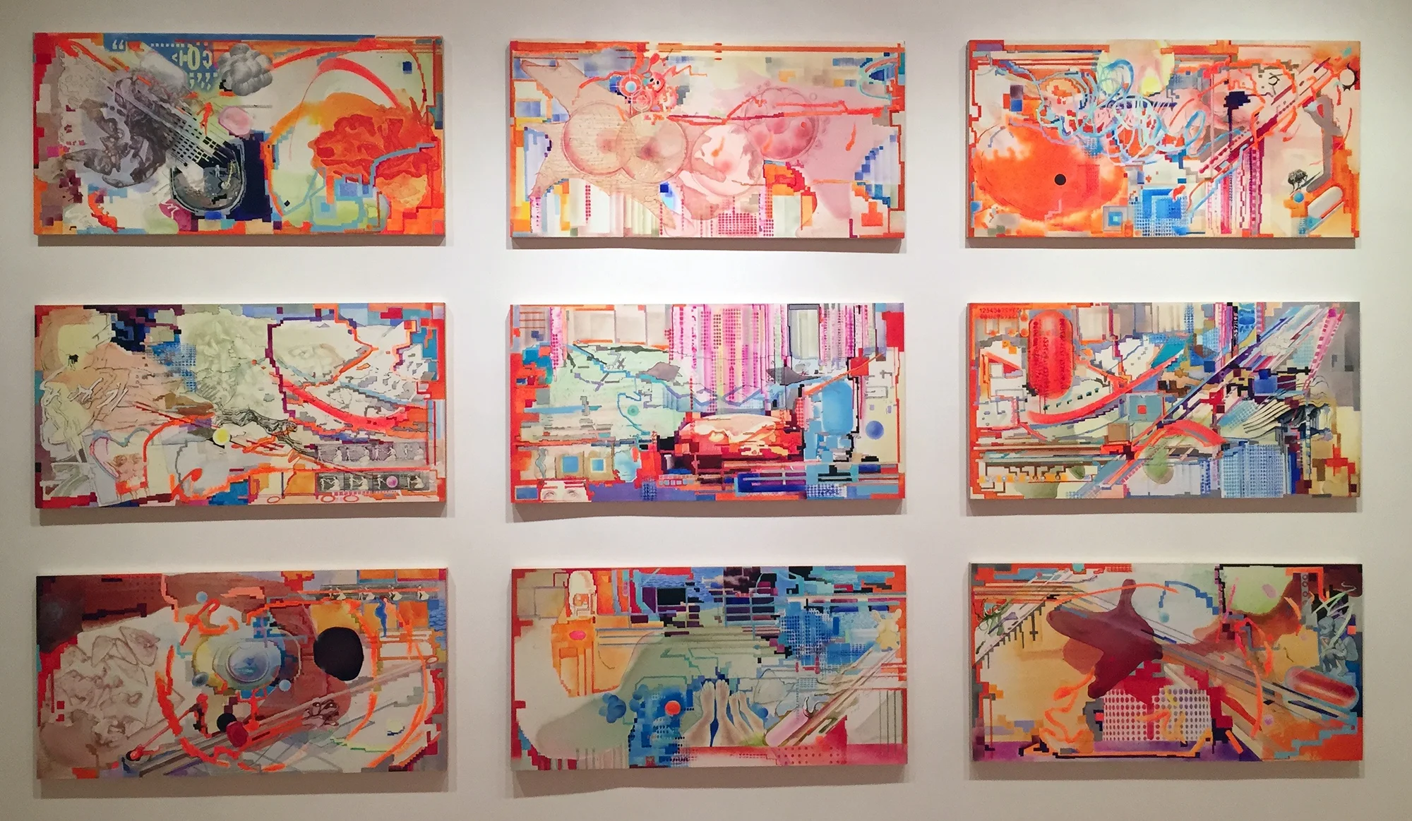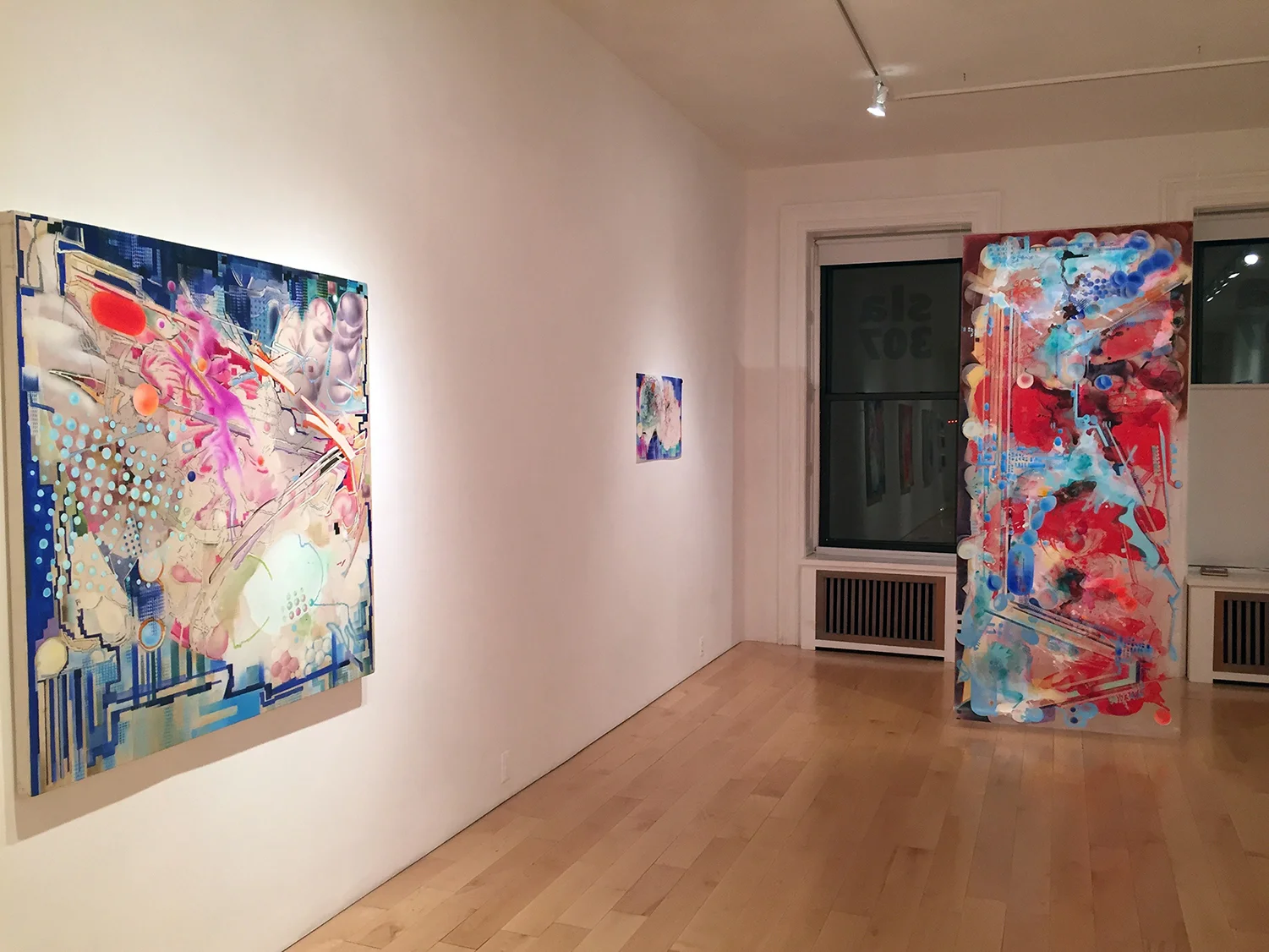 This exhibition features work created in recent years. The artist is using an expressionist language which involves analog/architectural and binary/digital-like structures breaking down within a luminescent contrasting color scale