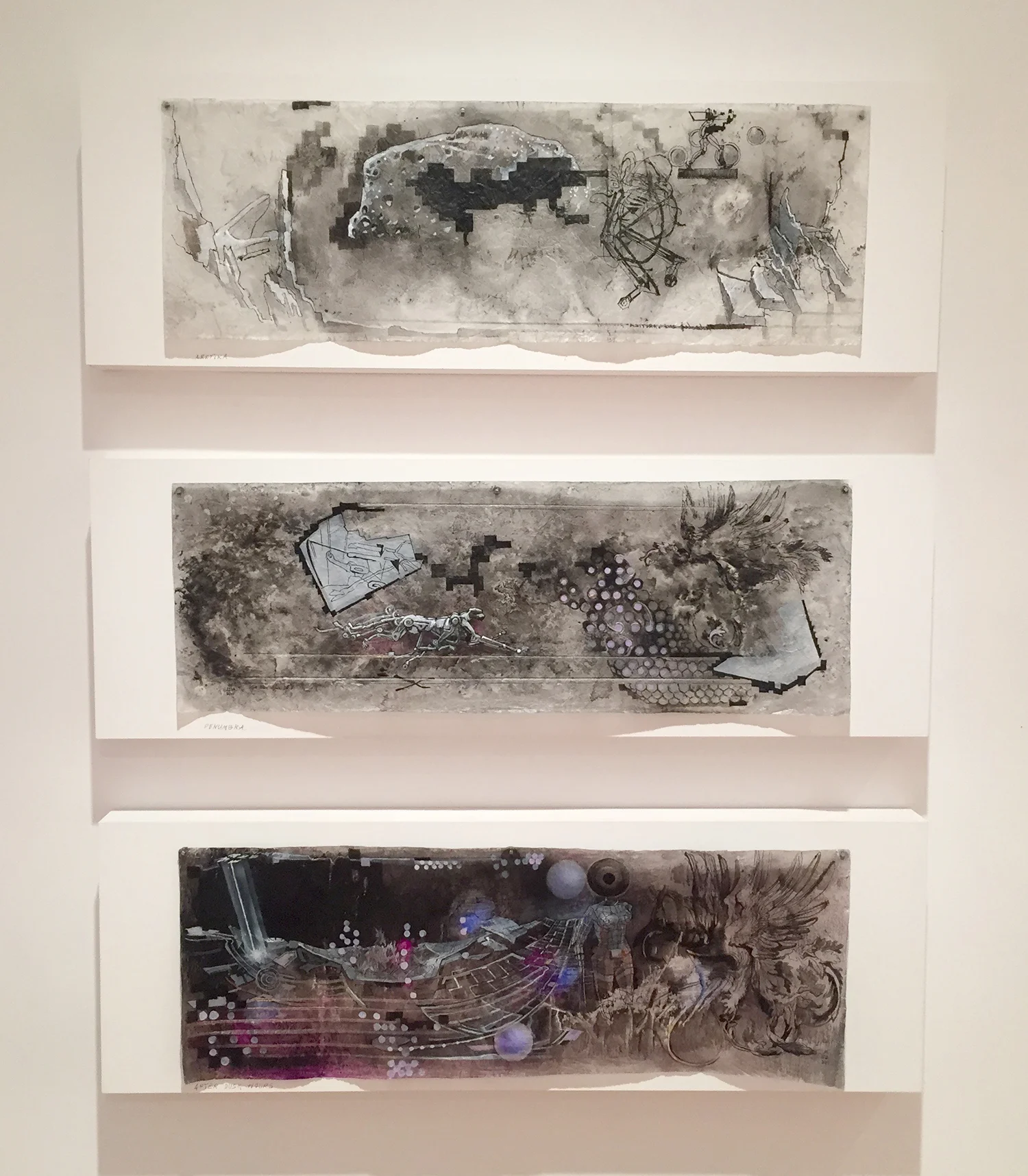 In the process of painting, composition emerges organically-a mark on a blank surface-random spill of paint. My choice-fluid acrylics and ink using paintbrush, pen and airbrush techniques. I introduce contrasting languages-organic and mechanical: the pools of paint forming into random shapes are overlaid with gestures of paintbrush and pen and gestures using machine-airbrush". Ieva Mediodia